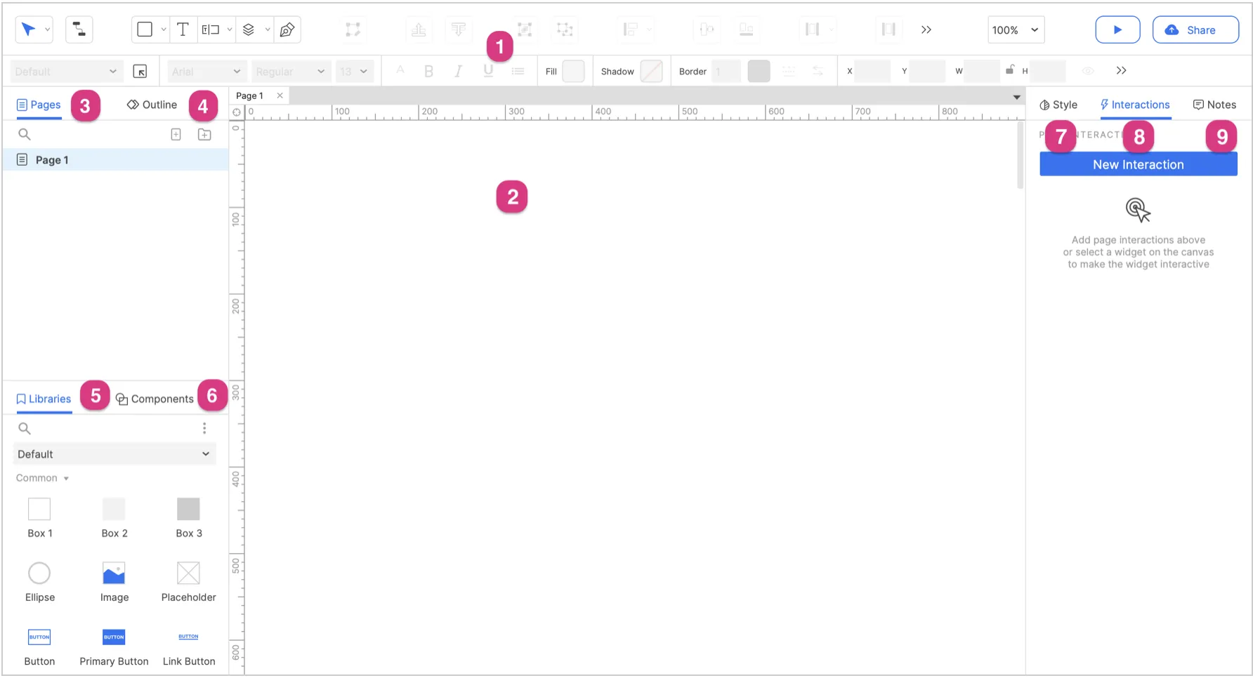 - Main Toolbar and Style Toolbar: Perform common actions like arranging widgets, styling widgets, and publishing. Change the cursor tool between selection modes, connector mode, and drawing tools.